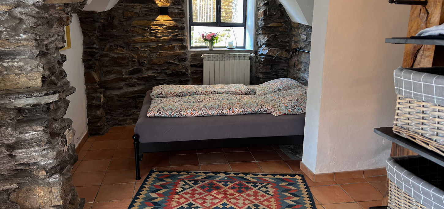 In dem idyllischen Bergdorf Pantasina steht im ligurischen Hinterland das Casa Alvise vecchio. Direkt in den Felsen gebaut, mit über 200 Jahre alten Gemäuer, erstrecken sich die gemütlichen und modernen eingerichteten Räume. Auf der obersten Etage liegt die vollausgestattete Küche und ein Esstisch für vier Personen. Das Wohnzimmer, das Herzstück des Hauses, öffnet sich mit zwei großen bodentiefen Fenstern zum Tal hin und bietet einen traumhaften Blick auf das Meer. Von hieraus gelangt man auch zu dem kleinen Balkon, der zu einem entspannten Frühstück in der Morgensonne einlädt. Zwei Ebenen weiter unten befindet sich das Schlafzimmer mit Doppelbett und direktem Zugang in Garten. Zwischen den Orangenbäumen und Rosmarinsträuchern ist die Natursteinterrasse der perfekte Ort zum Sonnen oder für ein Essen am großen Gartentisch. In das großzügige Badezimmer mit Bidet, Dusche und Waschmaschine ragt der Fels des Berges. Die alten Gewölbe ziehen sich durch das ganze Haus. Durch die zwei zusätzlichen Einzelbetten im unteren Teil, bietet das Haus Platz für bis zu vier Personen.